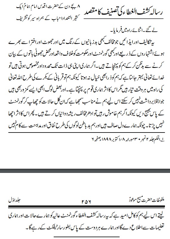 À 8 heures du matin, notre Noble Leader, Sa Sainteté, est allé se promener accompagné d’un grand nombre d’amis. Au cours de sa promenade, le Messie Promis a dit : “Nos adversaires m’infligent de la peine et du chagrin en utilisant un langage abusif dans des annonces pleines de mensonges et de calomnies, et en d’autres occasions, ils font des rapports mensongers et complètement faux au gouvernement et aux autorités afin qu’ils se méfient de moi. Si tout cela se limitait à ma seule personne, Dieu sait bien que je n’y aurais pas prêté la moindre attention. Car je suis prêt à m’offrir à Allah comme un agneau sacrifié. Cependant, toutes ces choses ont un effet direct sur l’ensemble de notre peuple. Certains sont faibles et ne peuvent supporter de telles souffrances. C’est pourquoi j’ai jugé bon de publier un rapport complet sur les circonstances réelles et de l’envoyer au gouvernement. Car si je reste silencieux, nos adversaires continueront à échafauder des complots, ce qui a un effet très néfaste. Puisque nos cœurs sont purs et que nous n’agissons pas de manière hypocrite ou complaisante comme ceux qui sont méchants de l’intérieur, je suis convaincu que mon traité Kashf-ul-Ghita (La vérité dévoilée) informera l’honorable gouvernement de mes antécédents personnels et de mes enseignements. Ce livreservira également de certificat dans les mains de mes amis