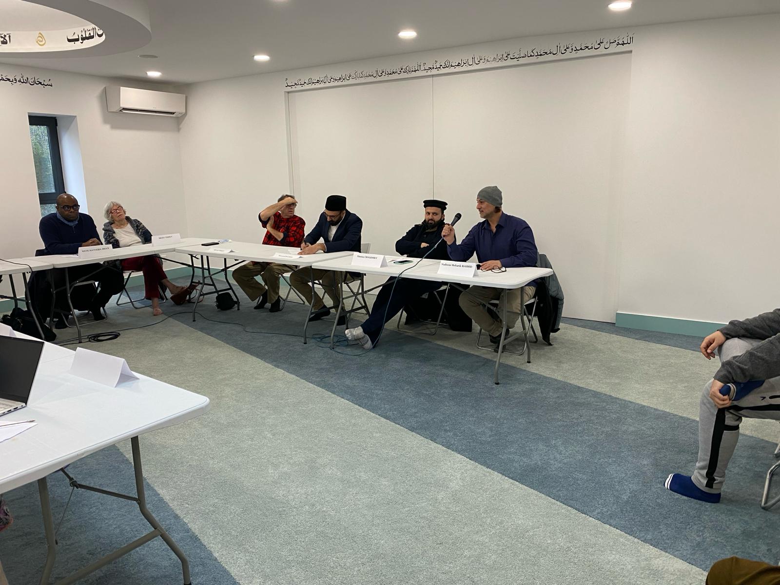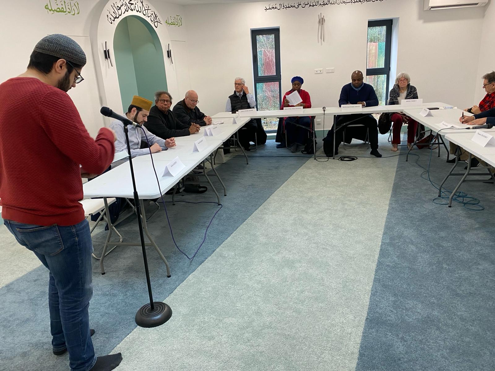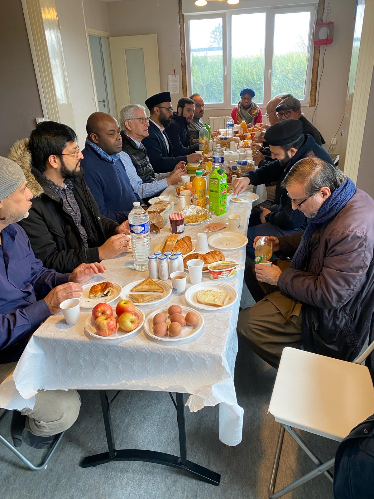 En retour, Dimanche, Le 18 fevrier nous les avons invités à partager un petit déjeuner dans notre Mosquée. A leur arrivées à 9H30, nous avons partagé un moment convivial ensemble et échange sur le même thème de la paix. Chacun a pris la parole en présence de notre Murabi Sb ainsi que huit membres de notre communauté, notamment Qaid MKA, Murabi Sb, et Sadr Sb Jamaat
